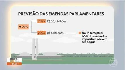 O Orçamento de 2026 prevê um montante total de R$ 61 bilhões em emendas. Desse valor, R$ 49,9 bilhões estarão sob o controle direto dos parlamentares, divididos entre emendas individuais (R$ 26,6 bilhões), de bancada (R$ 11,2 bilhões) e de comissão (R$ 12,1 bilhões). As emendas individuais e de bancada têm caráter impositivo, ou seja, o governo é obrigado a executá-las.